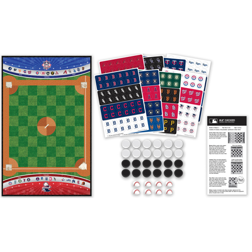 This MasterPieces MLB League Checkers Game is the classic game of checkers where the king wears a baseball! The MLB League checkers game includes 24 black and white checkers pieces, 8 baseball king pieces, a 13" x 20.5" MLB baseball field game board, 8 sticker sheets including all 30 MLB Teams, and an instruction sheet.